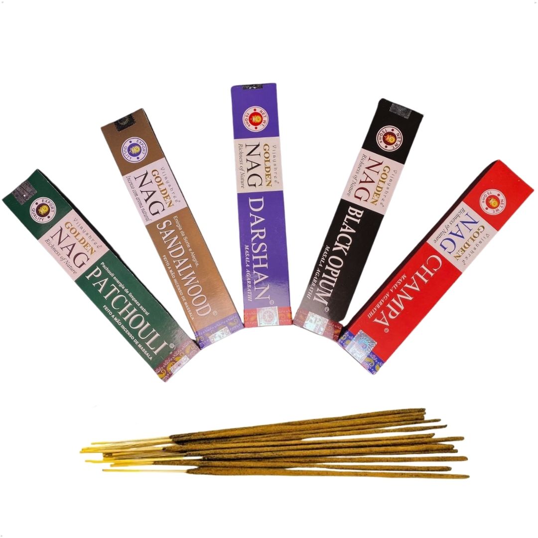 Este kit contém 5 caixas de incenso de vareta mais pedidos, totalizando aproximadamente 75 incensos. Cada kit é composto por uma variedade de aromas, portanto, nem todos os kits serão iguais ao da imagem.