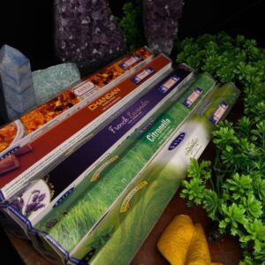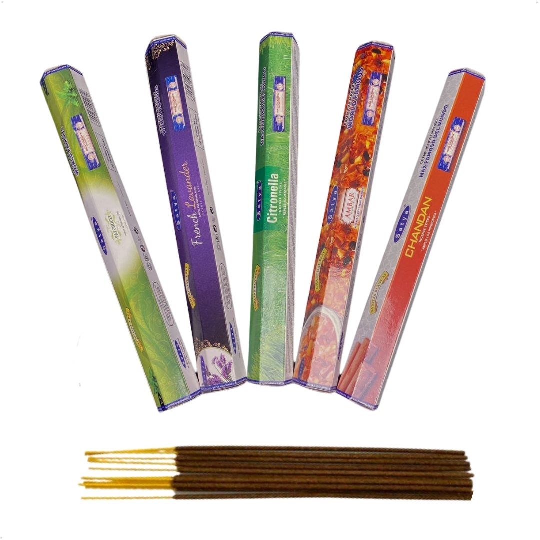 Este kit contém 5 caixas de incenso de vareta mais pedidos, totalizando aproximadamente 100 incensos. Cada kit é composto por uma variedade de aromas, portanto, nem todos os kits serão iguais ao da imagem.